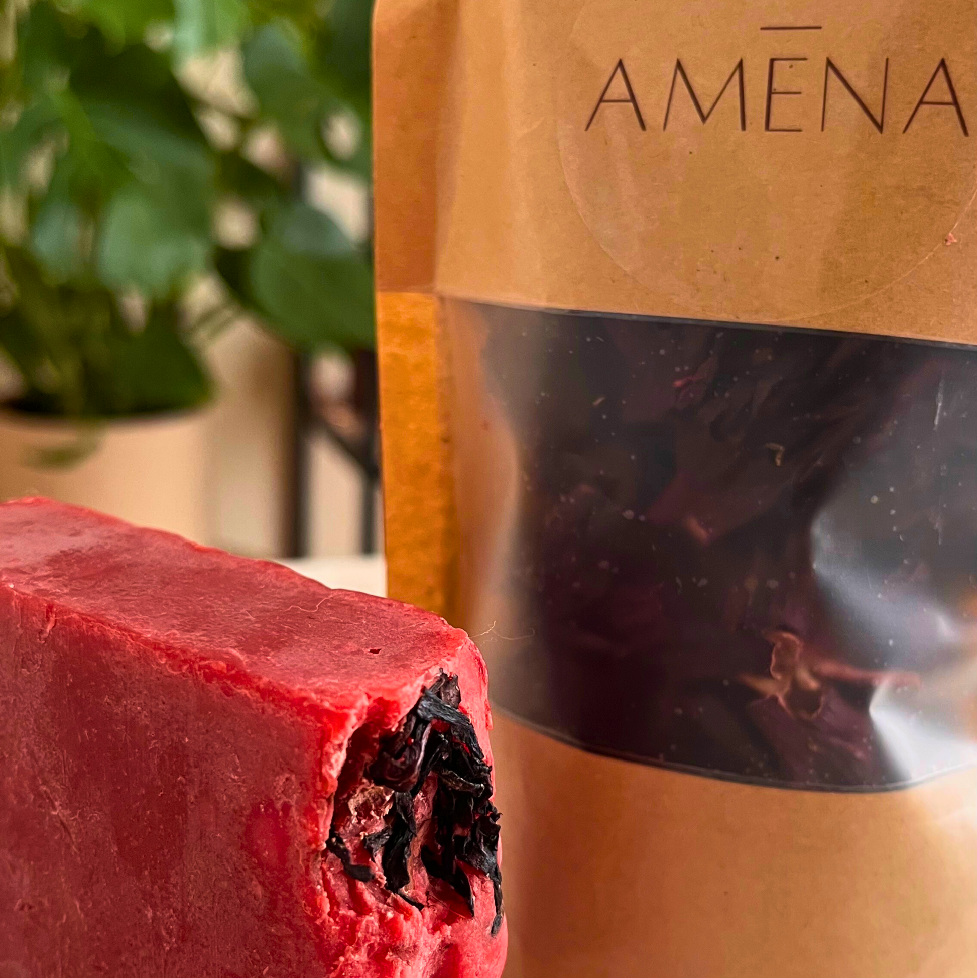 - Savon Karité & Hibiscus – Nettoie en douceur, apaise, nourrit, renforce la barrière cutanée.